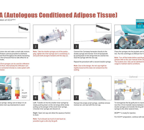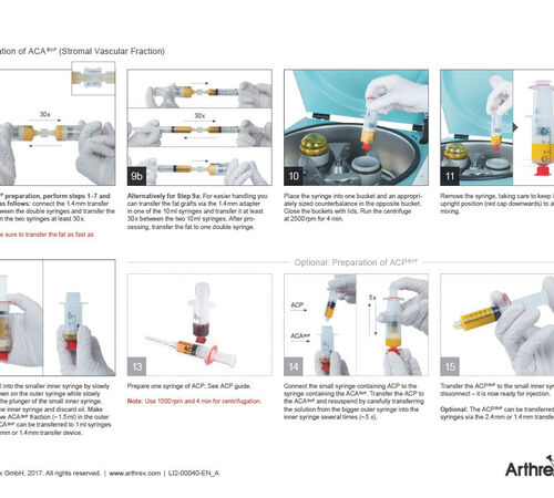 - Een kleine hoeveelheid (15 ml per zijde) eigen buikvetweefsel wordt via een kleine liposuctie afgenomen en meermaals gecentrifugeerd. Door het centrifugeren worden de eigen stamcellen geïsoleerd en vervolgens worden deze in het gewricht ingespoten.